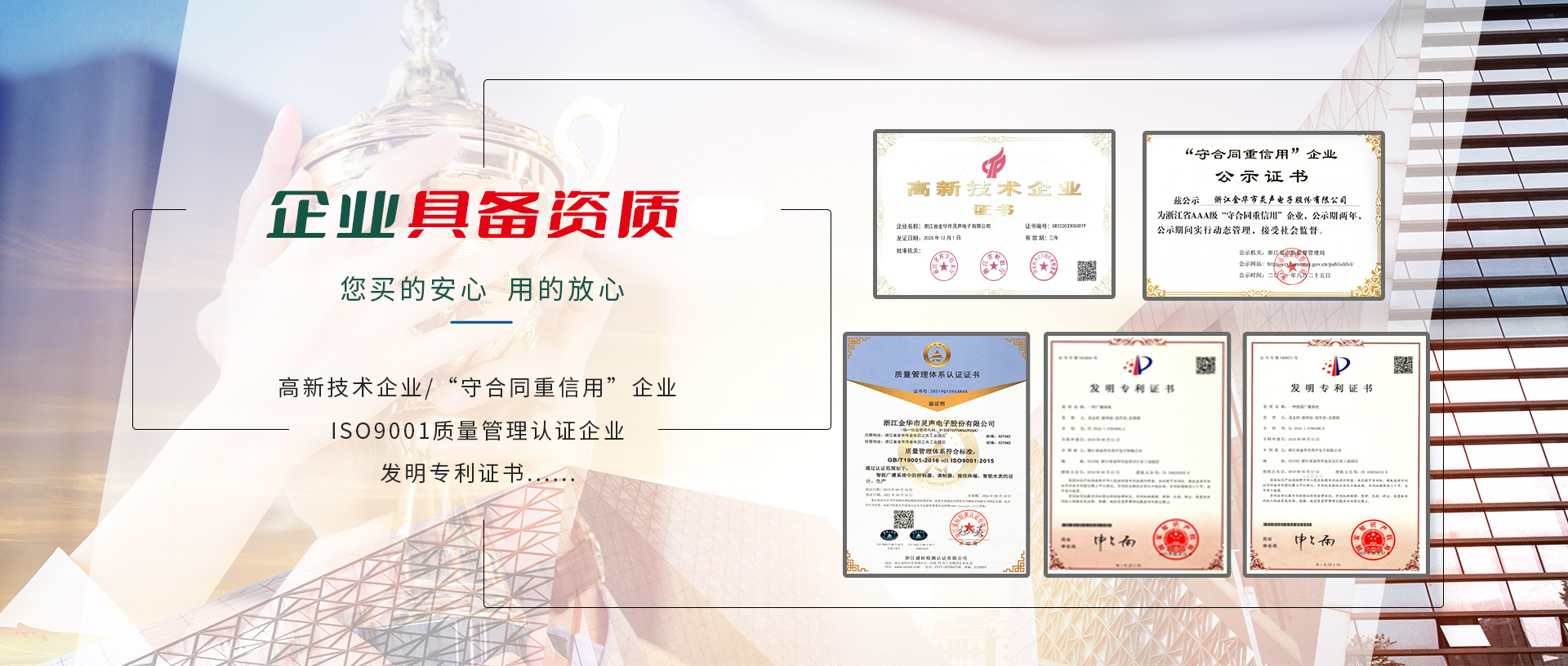 公司2001年通過(guò)ISO9001:2008國(guó)際質(zhì)量管理體系認(rèn)證、ISO14001:2004環(huán)境管理體系認(rèn)證,相關(guān)產(chǎn)品通過(guò)國(guó)家CCC認(rèn)證及CQC產(chǎn)品質(zhì)量認(rèn)證,并通過(guò)國(guó)家廣播電影電視新聞出版總局廣播電視設(shè)備器材入網(wǎng)認(rèn)可。公司注重產(chǎn)品的質(zhì)量與技術(shù)創(chuàng)新,現(xiàn)建有多條先進(jìn)的總裝、檢測(cè)流水生產(chǎn)線(xiàn)及各項(xiàng)檢測(cè)設(shè)備所需的儀器設(shè)備。還擁有全電磁屏蔽室一個(gè),所有高頻產(chǎn)品的調(diào)試均在屏蔽室中進(jìn)行。公司組建了高素質(zhì)的管理隊(duì)伍,設(shè)有研發(fā)部、生產(chǎn)部、銷(xiāo)售部、采購(gòu)部、質(zhì)檢部、售后服務(wù)中心及財(cái)務(wù)部等部分,并與國(guó)內(nèi)多家大專(zhuān)院校、科研單位建立長(zhǎng)期合作關(guān)系,成立了近乎是技術(shù)研發(fā)中心,是金華市職業(yè)技術(shù)學(xué)院重點(diǎn)示范實(shí)習(xí)基地。公司產(chǎn)品先后被浙江、江蘇、重慶、四川、甘肅、山東、湖南、湖北、貴州等文廣新局、電視臺(tái)、氣象局普遍采用,覆蓋全國(guó)各省市800多家縣(市)文廣新局、廣播電視臺(tái),并廣泛采用于教育行業(yè),尤其是在近年來(lái)的農(nóng)村應(yīng)急廣播“村村響”工程中,靈聲公司中標(biāo)承建的“村村響”工程贏(yíng)得了各省市廣播電視劇領(lǐng)導(dǎo)、專(zhuān)家們的一致好評(píng)!